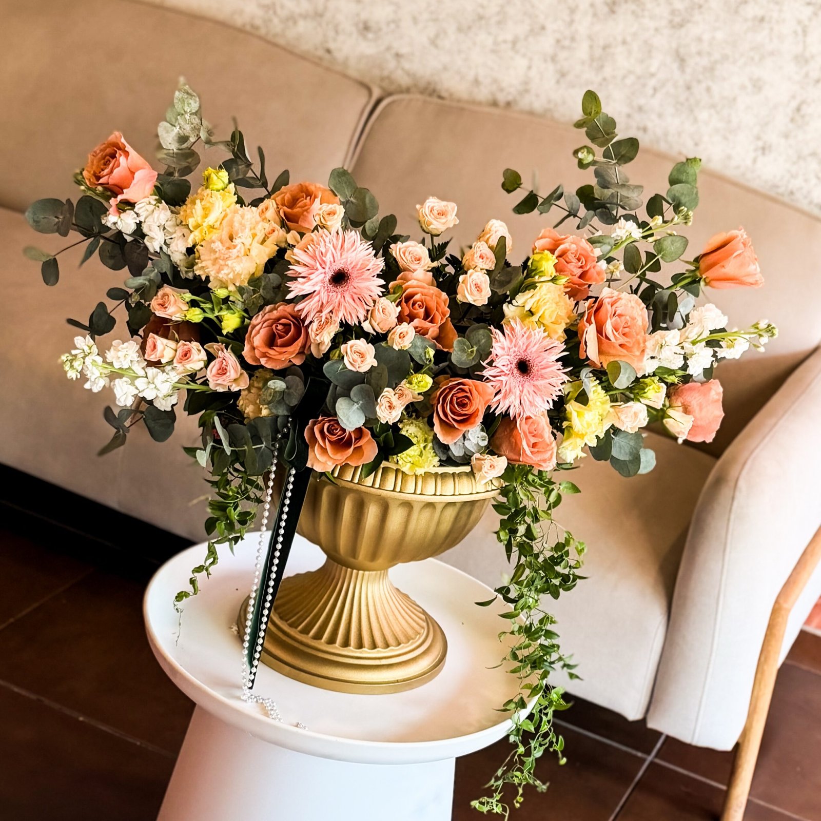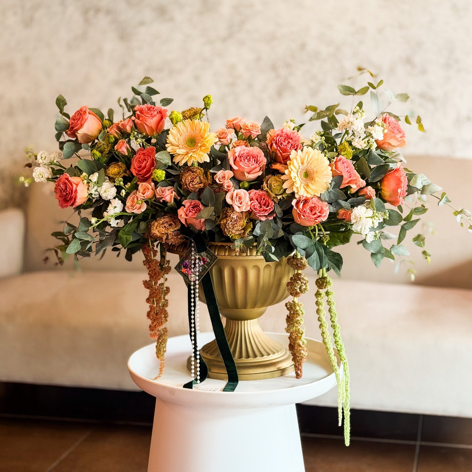 Amore della Mia Vita es un arreglo elegante que combina flores frescas y follajes en una composición armoniosa y llena de sentimiento. Inspirado en un jardín íntimo y refinado, transmite amor, delicadeza y distinción.