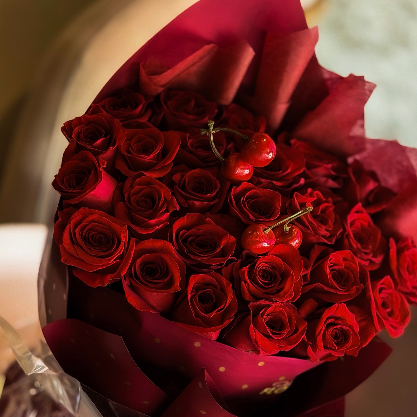 Un arreglo de rosas rojas que celebra el amor con un detalle inesperado que lo hace único🍒. Romántico, coqueto y perfecto para sorprender.