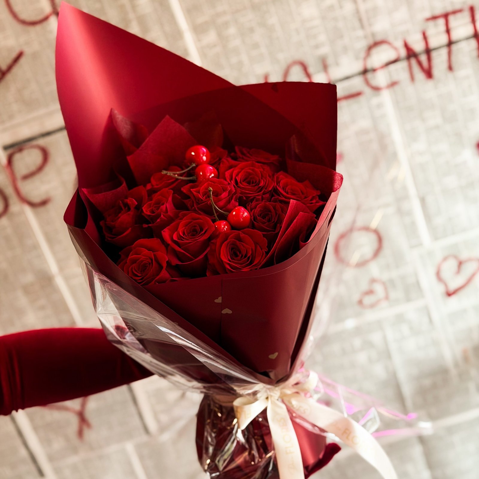 Un arreglo de rosas rojas que celebra el amor con un detalle inesperado que lo hace único🍒. Romántico, coqueto y perfecto para sorprender este San Valentín