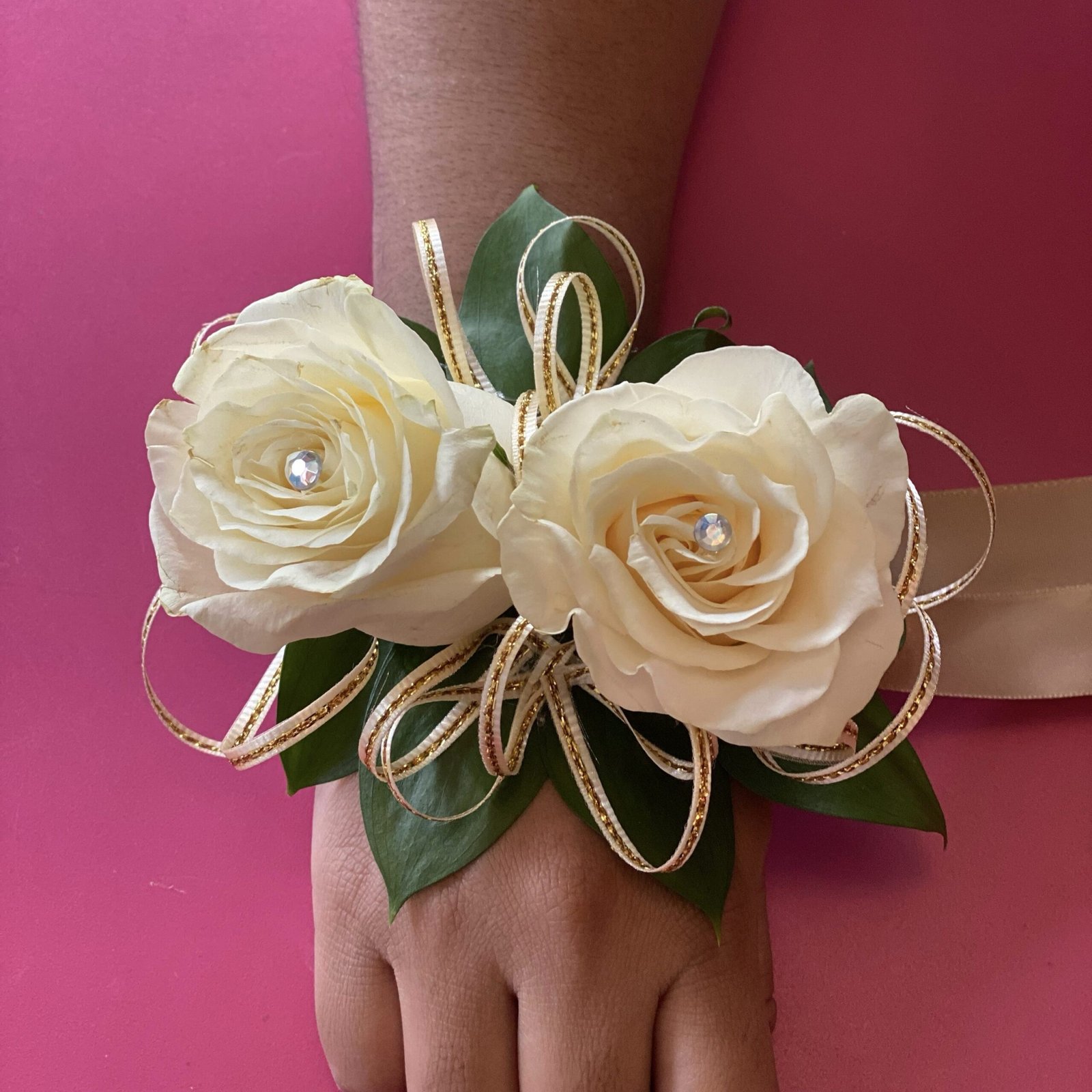 Celebra ese gran día con estilo y elegancia. Nuestro corsage de muñeca combina rosas y follaje delicado, diseñado para resaltar tu look y hacerte brillar en cada foto. Perfecto para graduadas, damas de honor o invitadas especiales. 💐