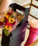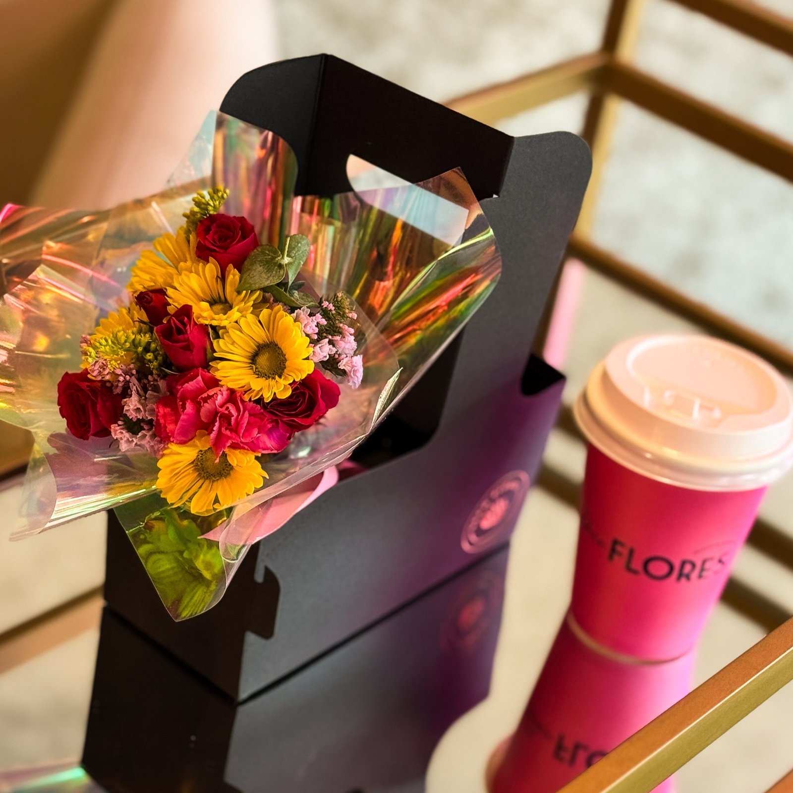 Un delicado mini ramo acompañado de café listo para llevar, pensado para convertir lo cotidiano en algo especial.