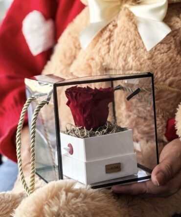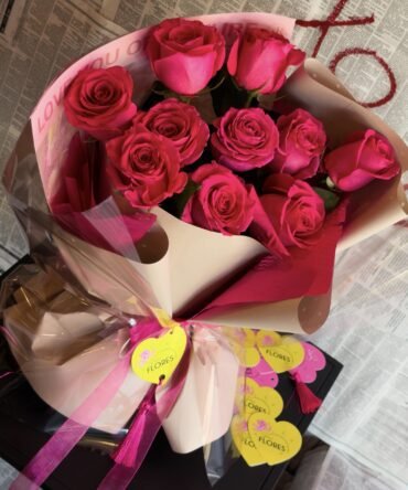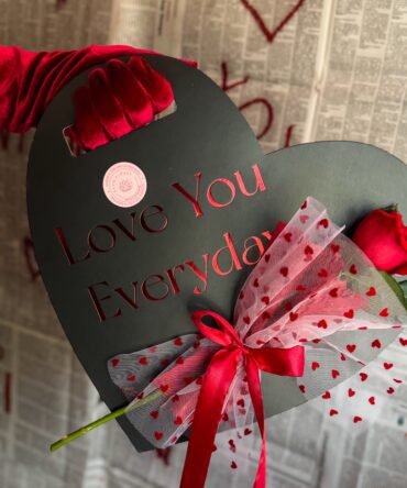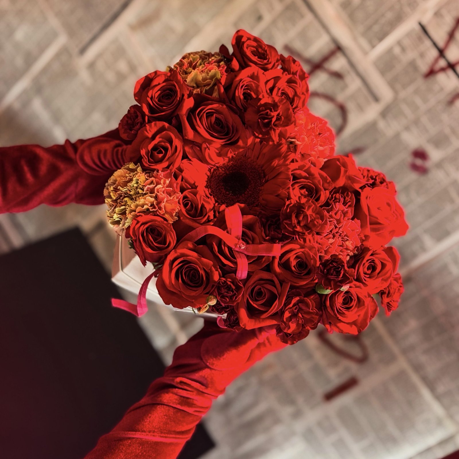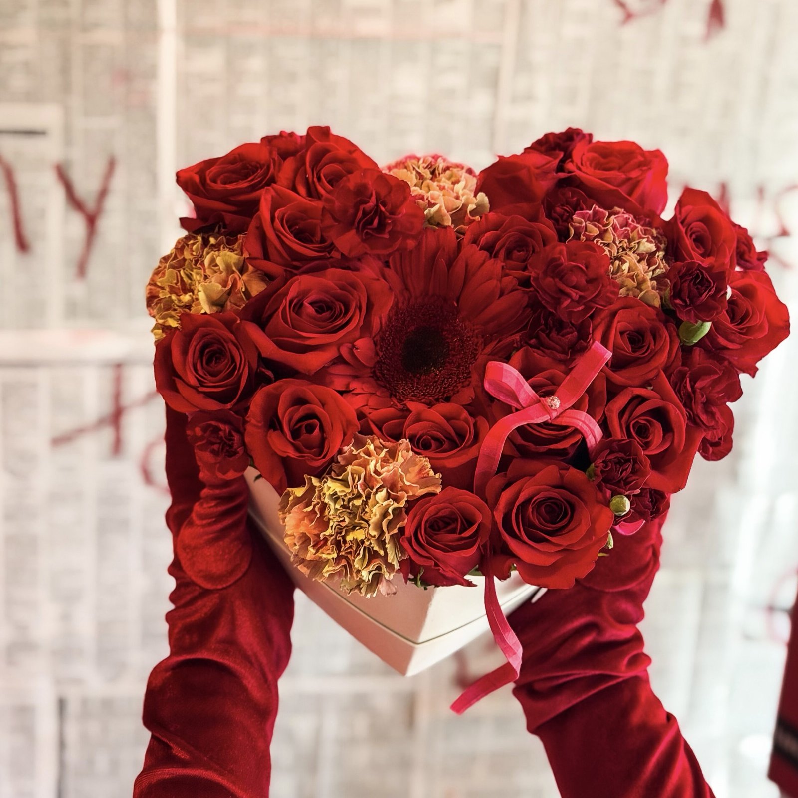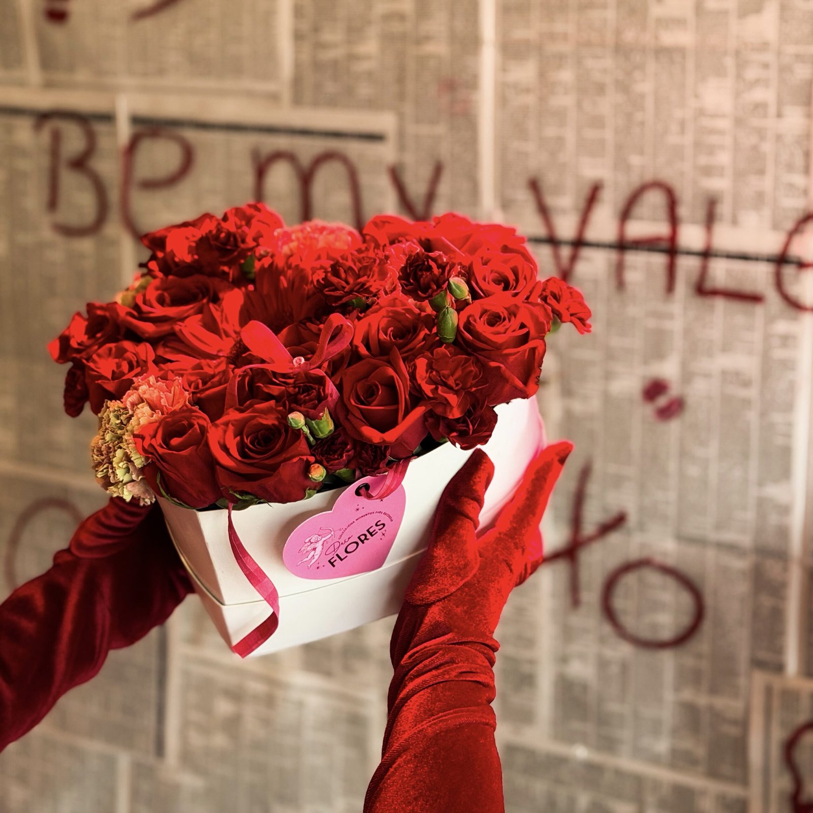 Una hermosa caja que resguarda un corazón de rosas y flores surtidas en un rojo apasionado. Este diseño, romántico y elegante, es la elección ideal para sorprender a esa persona especial con un detalle lleno de ternura y sofisticación.