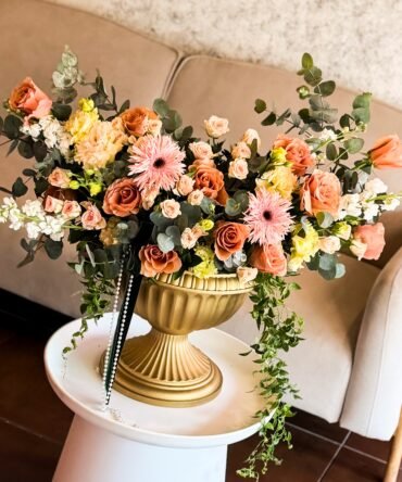 Un encantador arreglo floral presentado en una caja de madera con asa de cuerda, que combina rosas y follaje fresco que aportan movimiento y elegancia.