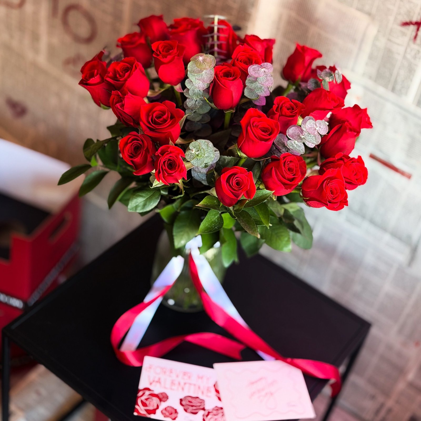 Rosas, fresco eucalipto y follaje un detalle que enamora a primera vista