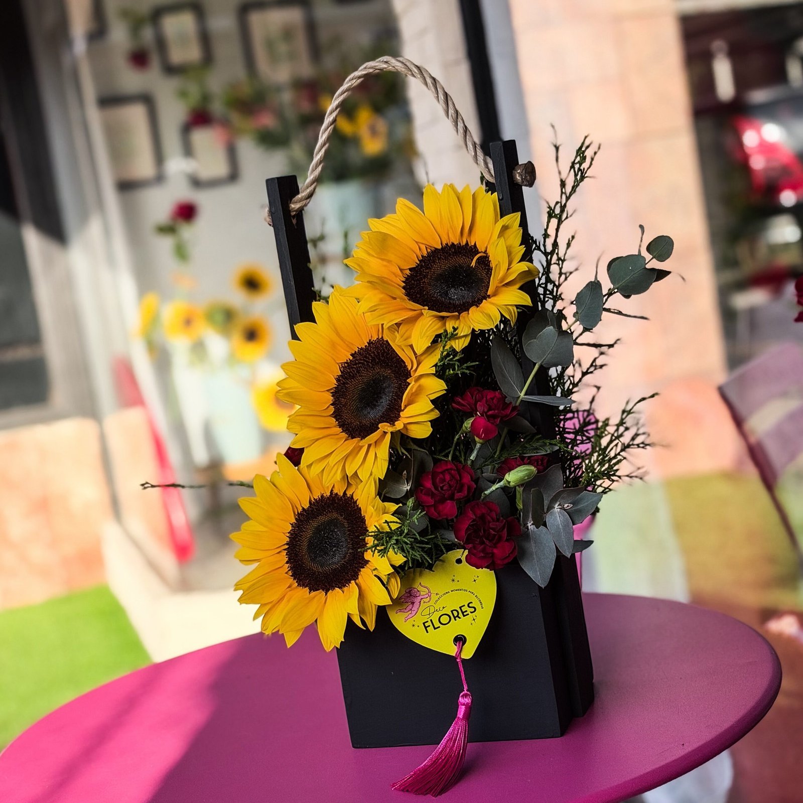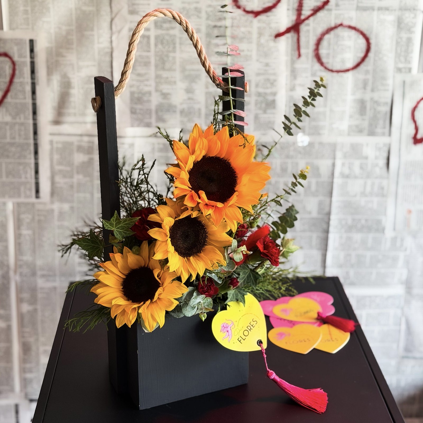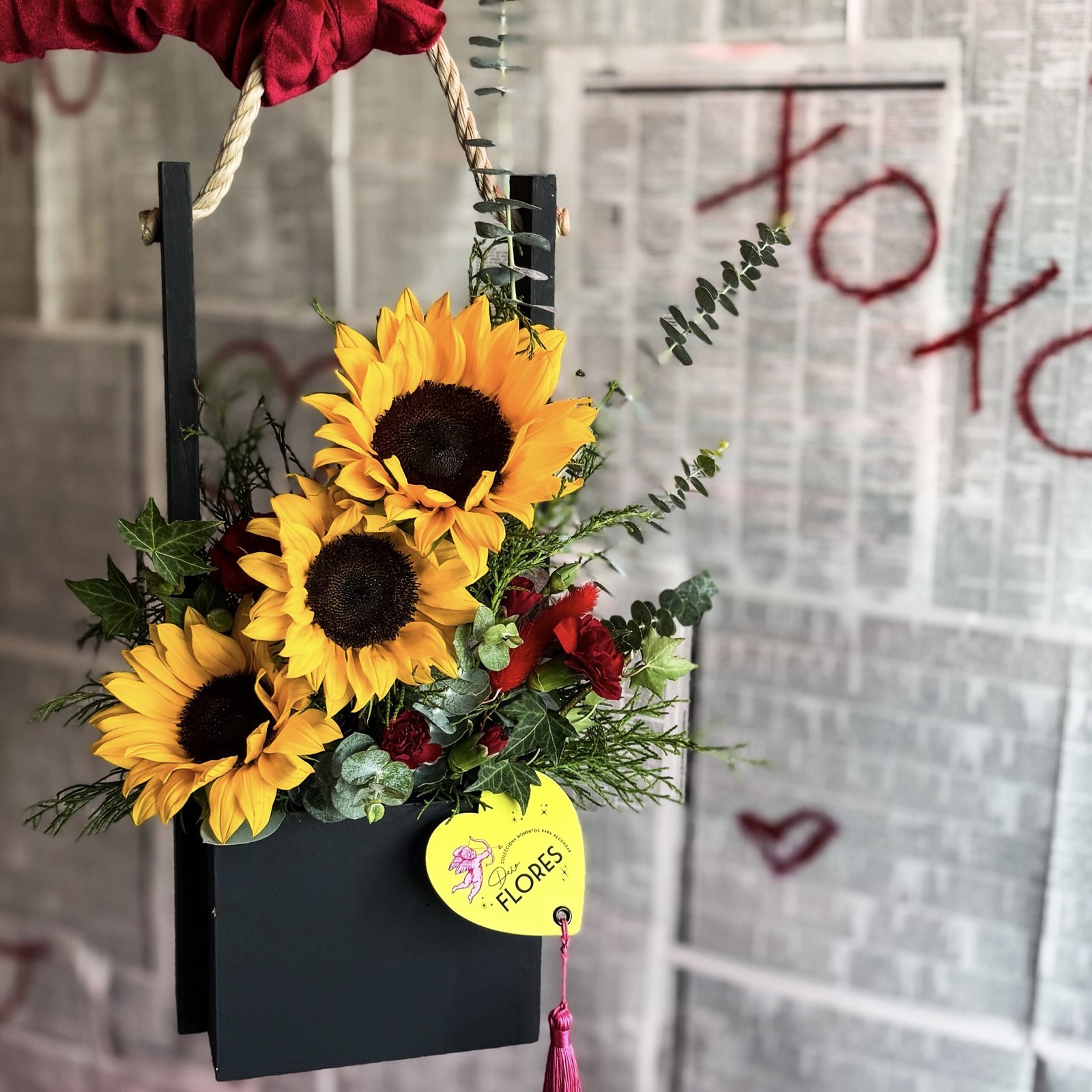 Porque el amor también brilla como el sol. Este diseño mezcla la fuerza de los girasoles con románticos toques rojos, simbolizando un cariño que siempre crece. Una opción hermosa y diferente para sorprender a quien llena tu vida de felicidad y buenos momentos.