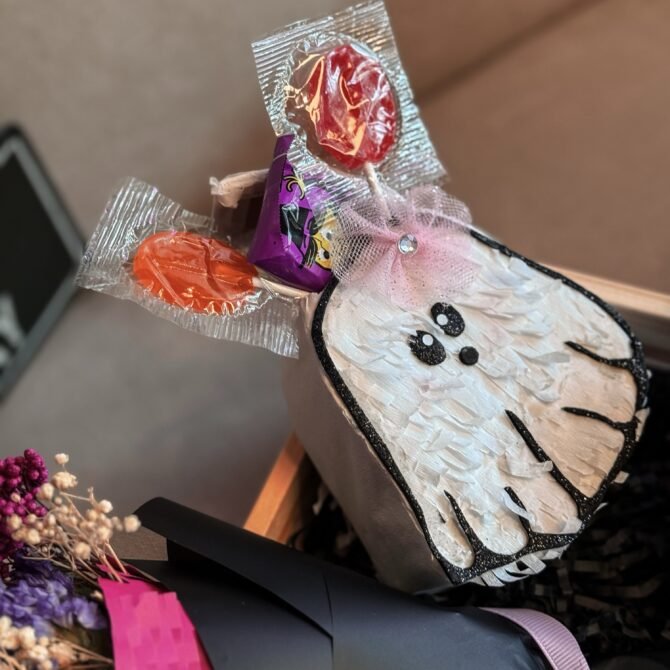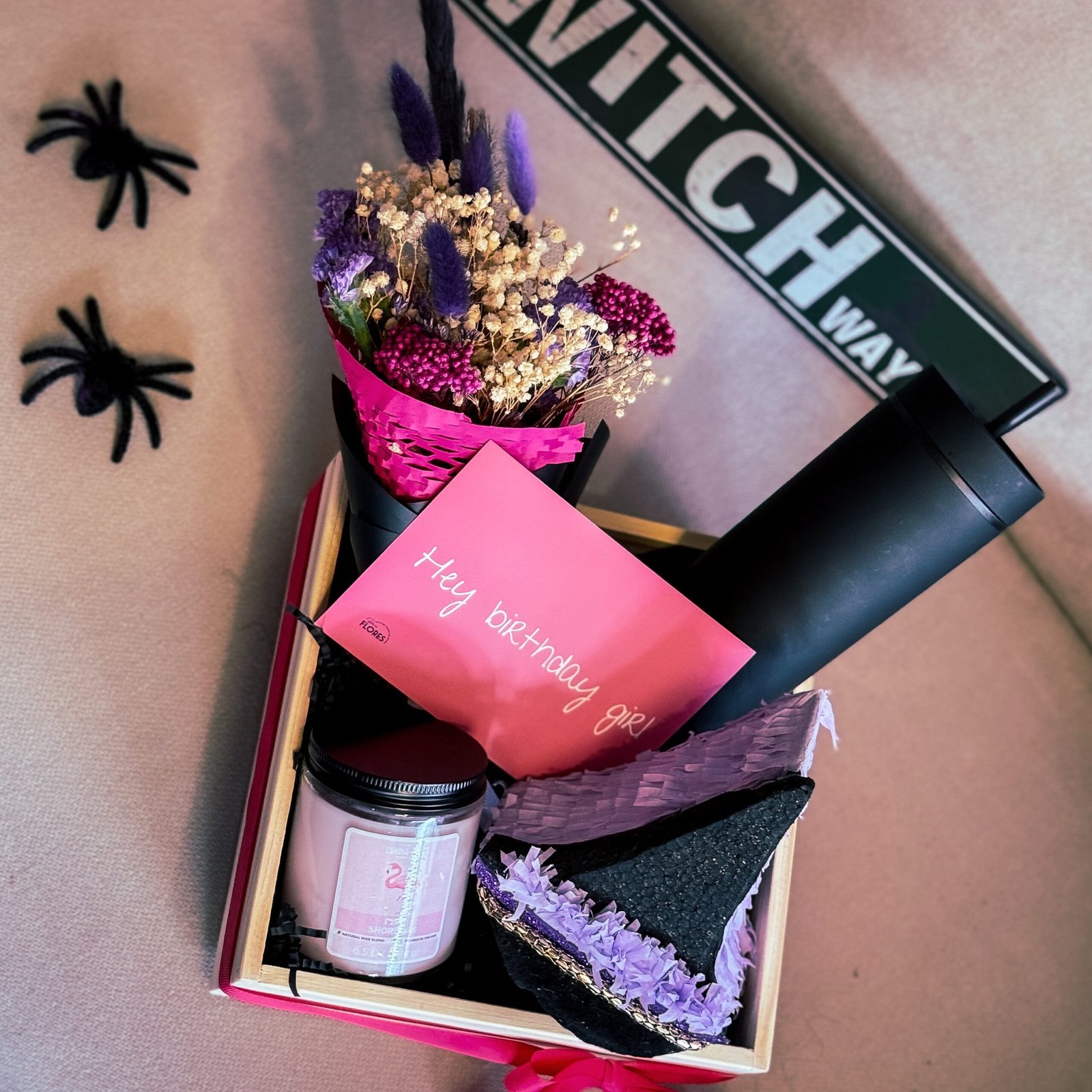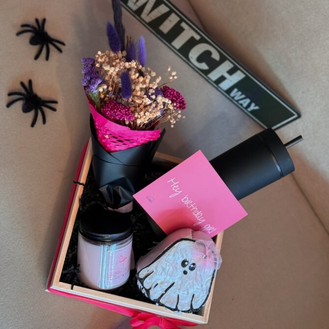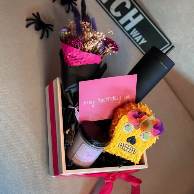 Celebra un cumpleaños con un giro encantador y lleno de magia. Nuestra Trick or treat box combina flores preservadas en tonos vibrantes, una vela aromática para endulzar el ambiente, un vaso negro personalizado con el nombre de quien recibe, acompañado de una mini piñata temática con golosinas que no pueden faltar en ningúna celebración. 🎂🎃
