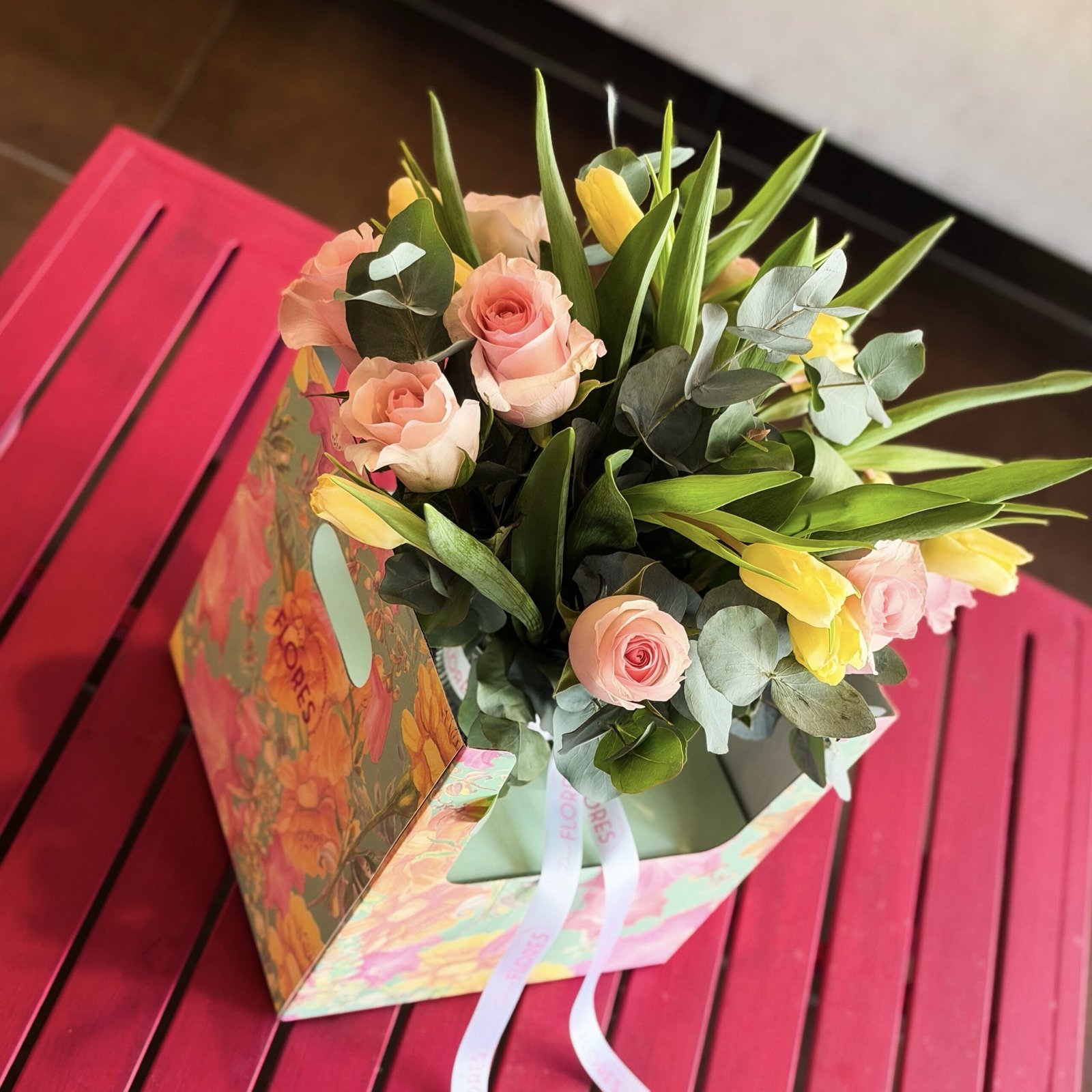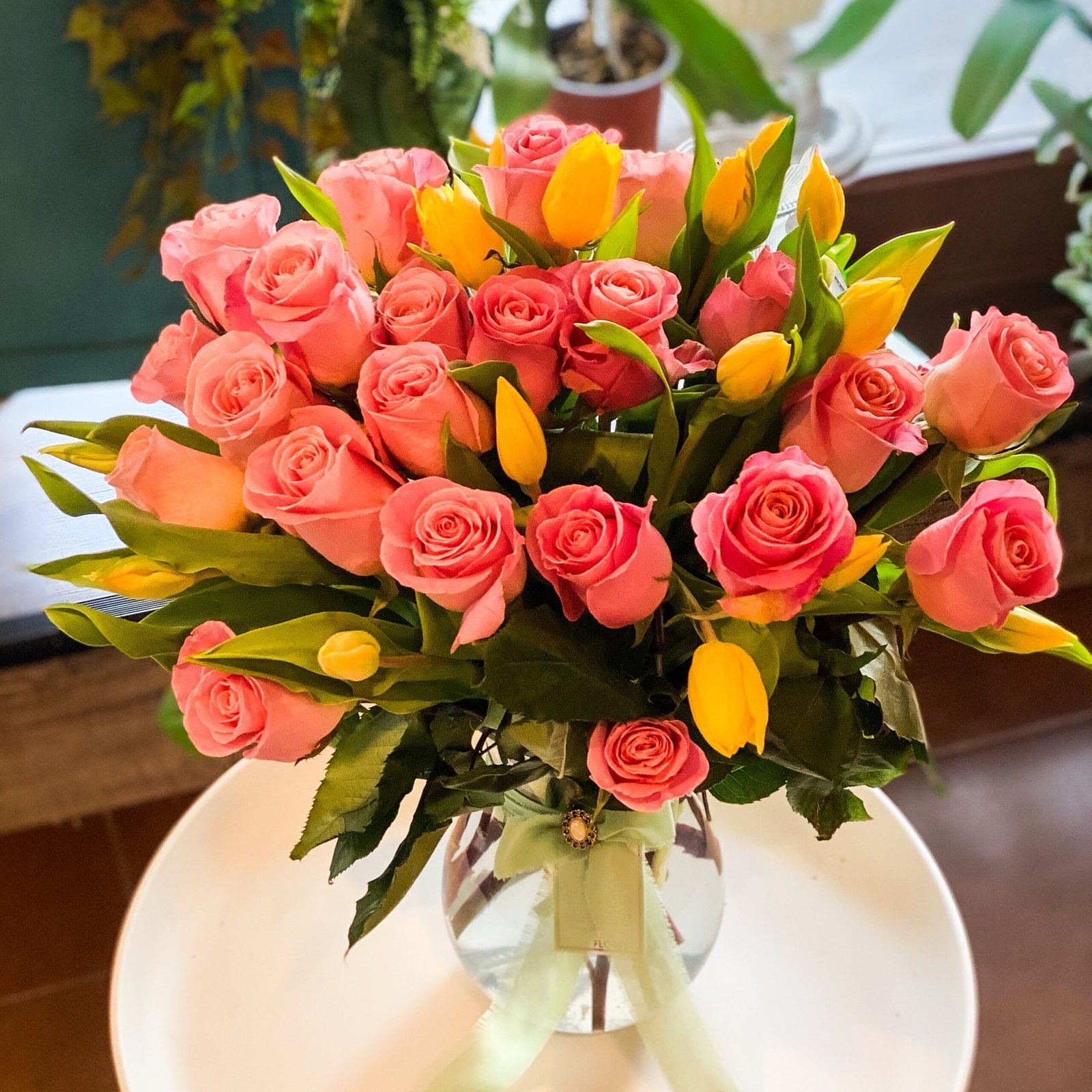 La suavidad de las rosas se combina con la energía vibrante de los tulipanes , creando un contraste lleno de luz y alegría. Acompañado de follaje natural y presentado en un florero de vidrio, este diseño es perfecto para expresar cariño, gratitud o celebrar momentos especiales con un toque delicado y sofisticado